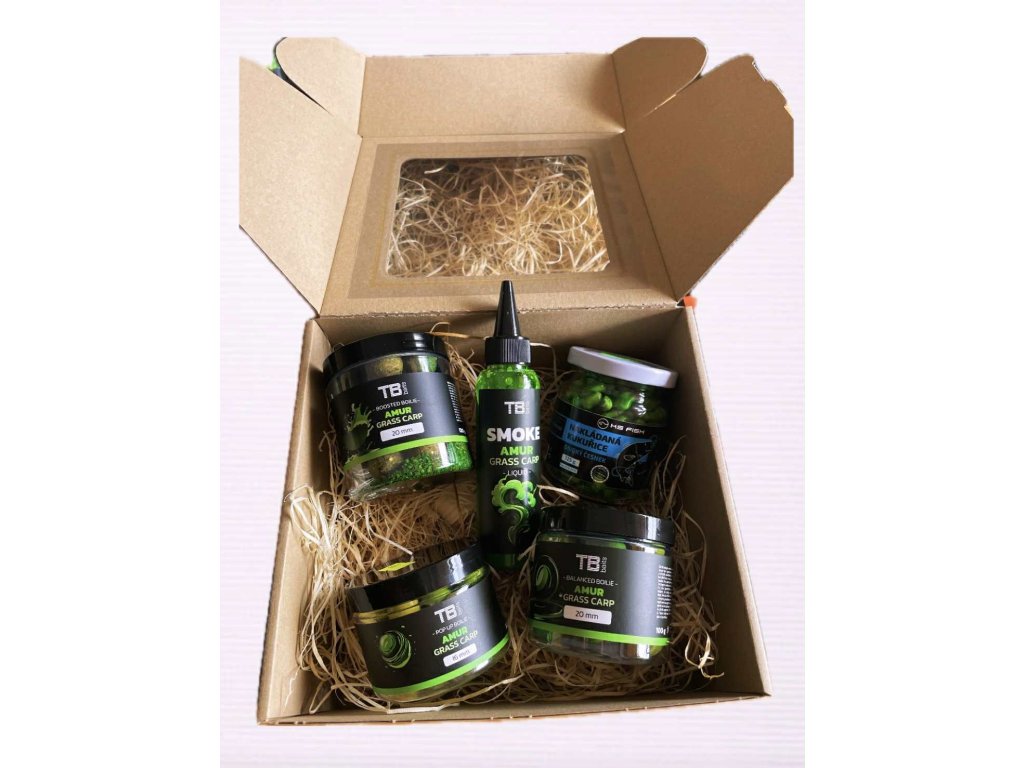 Box obsahuje: TB Baits Plovoucí boilie Pop-Up Amur + NHDC 50 g 16 mm, TB Baits Vyvážené Boilie Balanced + Atraktor Amur 100 g 20 mm, TB Baits Smoke Liquid Amur 100 ml, TB Baits Boosterované Boilie Amur 120 g 20 mm, Ks-fish nakládanou kukuřici divoký česnek, dřevitou slámu a dárkový box
