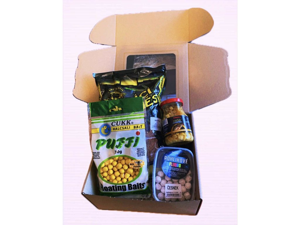 Box obsahuje: Carp Servis vnadící směs 1kg, Kukuřice ve sklenici Marlin, Rohlikové boilies Fluoro, Cukk Puffi med mini 30g, dřevitou slámu a dárkový box