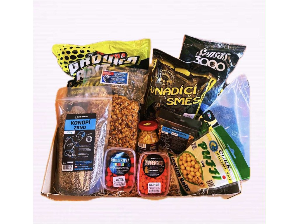 Box obsahuje: Carp Servis vnadící směs 1kg, Kukuřice ve sklenici Marlin, Rohlikové boilies Fluoro, Cukk Puffi med mini 30g, KS Fish foukaná pšenice 25g, Delika pet Fluoro zob 130ml, PARTIKL Vařený Partikl Mix 1kg, 3000 Carpes (kapr) 1kg, Krmítková směs profess 2kg, Řepka 1kg, Konopné semínko 500g, dřevitá sláma a dárkový box