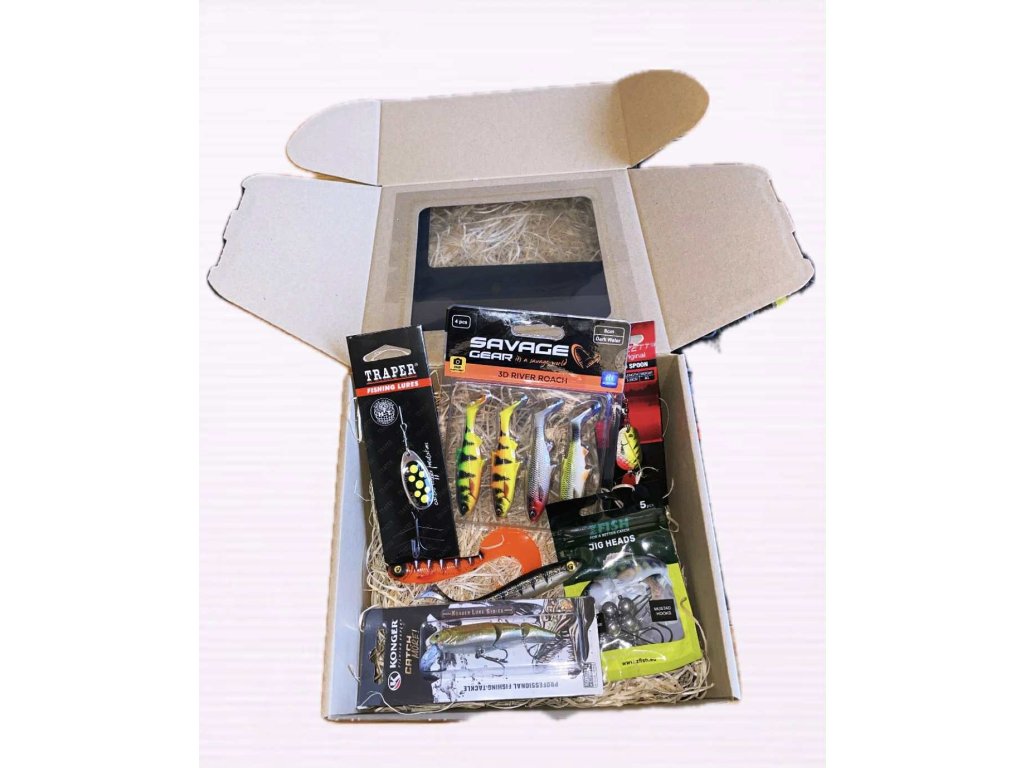 Box obsahuje: Savage Gear 3D 4 ks, DAM plandavka 6g, 3D gumy vel. 9-11 cm 2 ks, Traper Třpytka rotačka Seletc 1 - velikost 4/9.5g, Konger dvoudílný wobler, Zfish Jig Head Premium - 5 ks, dřevitá sláma a dárkový box