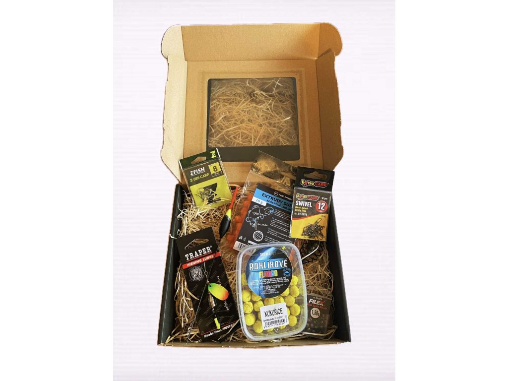 Box obsahuje: Háčky Carp Hooks, Obratlíky Extracarp, Filfishing Broky, Ks-Fish extrudy, Rohlíkové Boilies, Traper rotační třpytka, Splávek Filfishing, dřevitou slámu a dárkový box